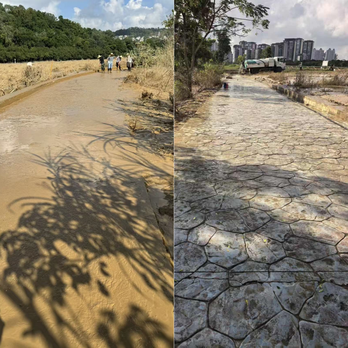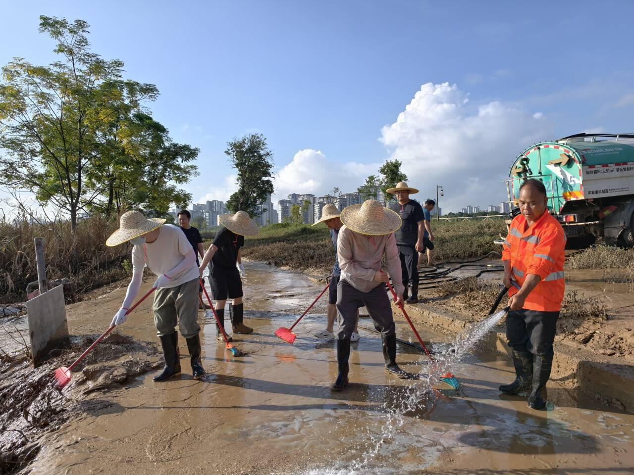上午8點,志愿者們攜帶鐵鏟、刮泥板、掃帚、垃圾袋等工具,準時在指定區(qū)域集合。現(xiàn)場的淤泥最深處達10余厘米,腳一踩便陷進去難以拔出,鏟子剛插進泥里就被牢牢黏住?!按蠹曳止じ桑裙伪韺幽?,再清垃圾!” 隨著一聲號召,志愿者們迅速分組行動:有的彎腰緊握刮泥板,順著步道紋理反復刮除黏連的淤泥;有的扛著水管,利用高壓水槍沖刷地面;有的拎著垃圾袋,蹲下身細致?lián)焓安卦诓菘p里的垃圾;有的則推著清運車,來回穿梭將裝滿淤泥和垃圾的袋子及時運離現(xiàn)場…… 各個環(huán)節(jié)銜接緊密、井然有序。盡管天氣炎熱,汗水順著臉頰滑落、浸透衣衫,志愿者們的熱情與干勁絲毫未減,充分展現(xiàn)了國企的責任與擔當。